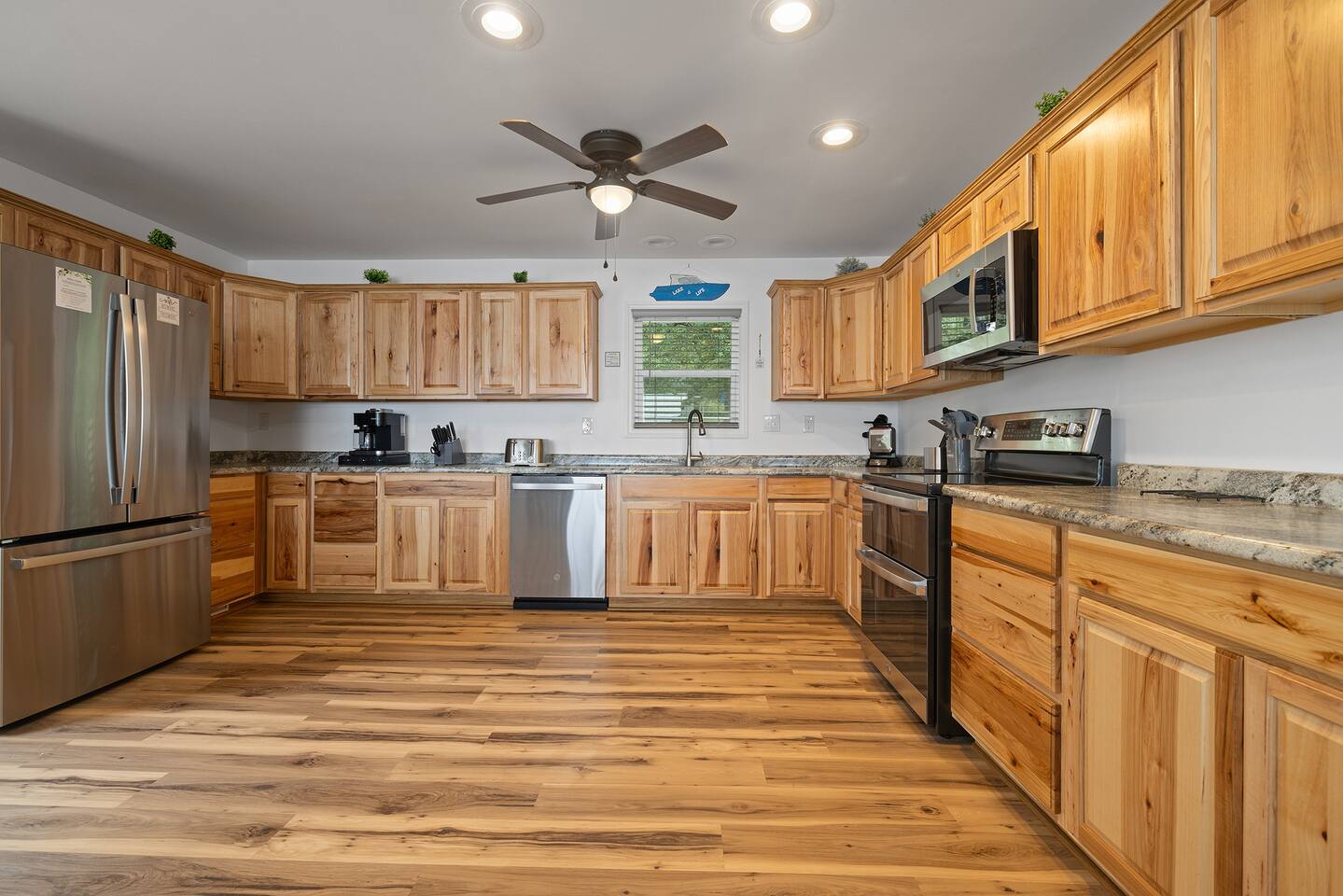 Head outside to explore the outdoor amenities, starting with the downstairs deck, where you can find your bliss in the 6-person hot tub. Challenge a travel companion to a game of Giant Connect 4, cornhole, or beer pong table. Relax on seating, enjoying the spectacular view on both upstairs and downstairs decks. Enjoy exploring the large, spacious, wooded property.