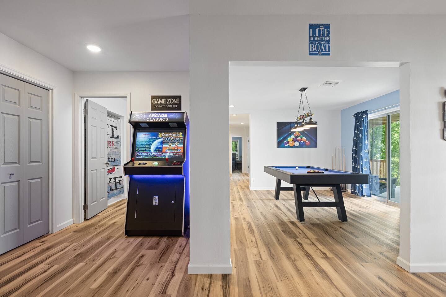 Back inside, have a blast in the downstairs game room with pool table, 2-player arcade console with 4,500 games, and a checker/chess coffee table that opens up to reveal many more games such as card games and Jenga. Enjoy a movie night with the 50” ROKU smart TV, comfy sofa, and four barrel-style chairs.