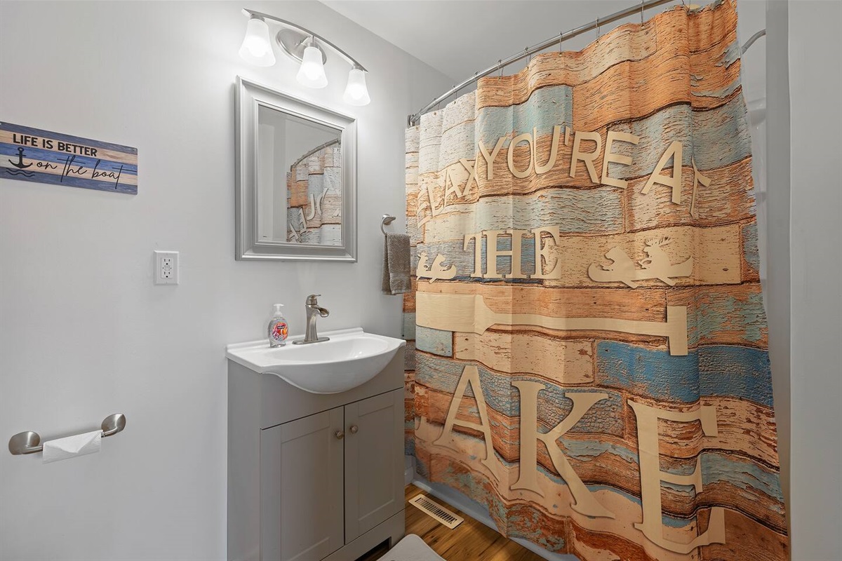 Wind down to sleep watching the 43” TCL ROKU smart TV. Store your belongings in two dressers, a closet, and a luggage rack. You’ll find a seating area for two for reading and dressing, along with direct access through sliders to the deck and its magnificent view of the lake. Enjoy the warmth and ambience of the electric fireplace and carpeting to greet your toes on chilly mornings. You’ll love the convenience of the ensuite bathroom with tub/shower combo and all bathroom essentials, such as towels, toiletries, and hair dryer.